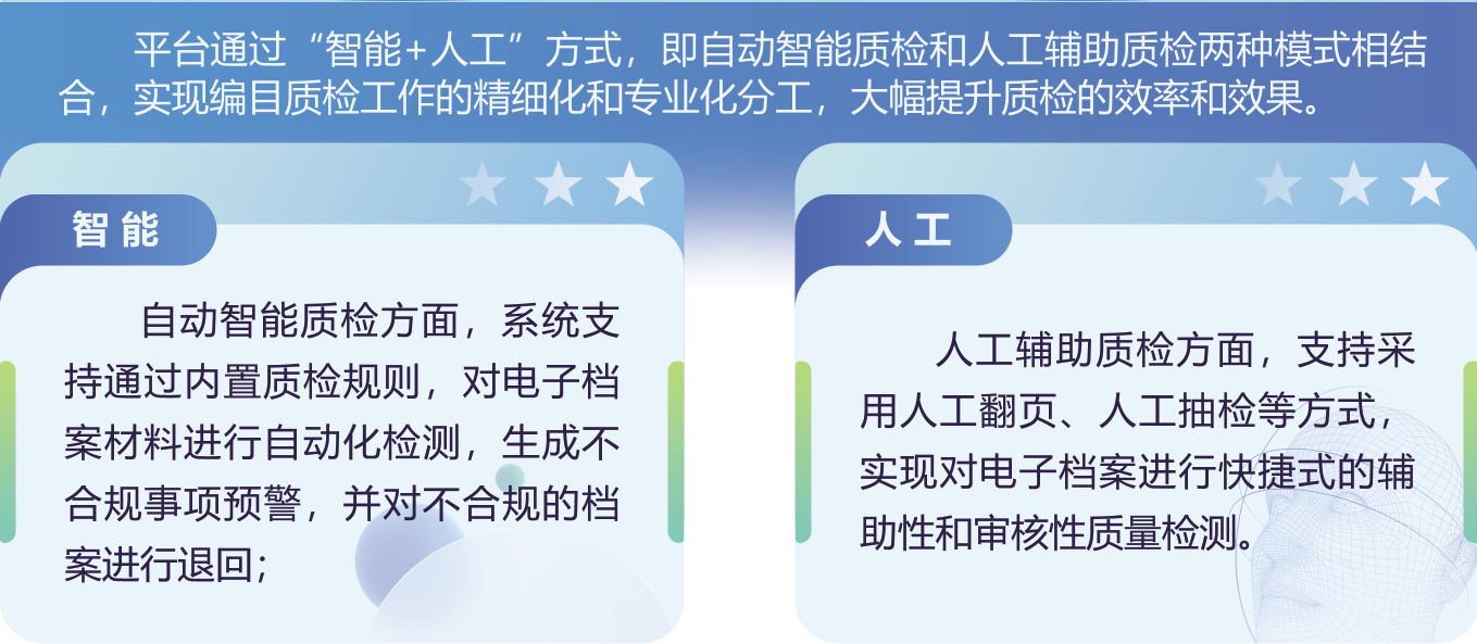 数字化编目质检平台是基于图像识别、语义理解和机器学习等人工智能技术,对数字化加工后的文书材料,以及在审案件的电子卷宗,进行标准化、集约化和智能化编目质检的信息化平台。该平台通过“智能+人工”方式,即自动智能质检和人工辅助质检两种模式相结合,实现编目质检工作的精细化和专业化分工,大幅提升质检的效率和效果。