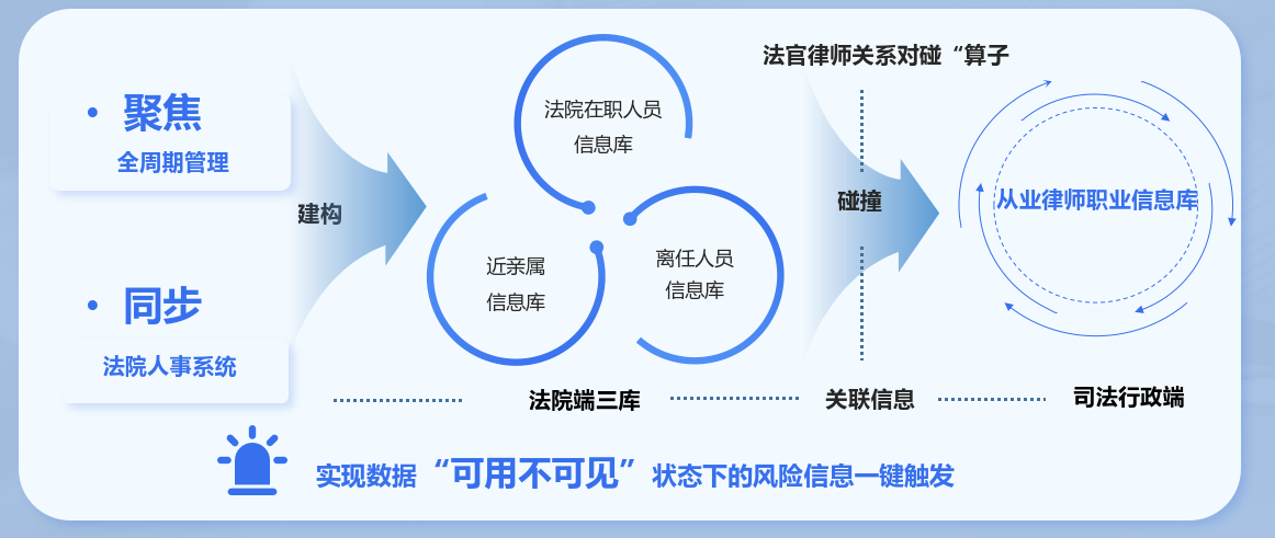 根据两高一部关于规范法官、律师接触交往及离任人员从业《两个意见》要求,我们聚焦“全周期管理”理念,同步法院人事系统,构建法院在职人员信息库、近亲属信息库、离退休人员信息库(即三库),在省委政法委的大力指导和省司法厅的大力配合下,建成法官律师关系对碰“算子”,实现法院端三库和司法行政端从业律师职业信息库的关联信息碰撞,实现数据“可用不可见”状态下的风险信息一键触发。