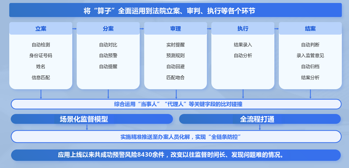 我们将“算子”全面运用到法院立案、审判、执行等各个环节,基于不同场景,综合运用“当事人”“代理人”等关键字段的比对碰撞形成场景化监督模型,和办案系统全流程打通,实施精准推送至办案人员化解,实现“全链条防控”。应用上线以来共成功预警风险9660余件,改变以往监督时间长、发现问题难的情况。