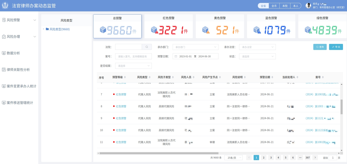 根据案件潜在风险,形成确定红、黄、蓝、绿四色预警,实现分级处置和管控,并归集过程中风险类型、预警情况、交办情况全量数据,形成个人、部门、法院的整体风险画像;此外,进一步强化和其他数据交叉比对,例如和案件发改率等进行对碰,自动生成风险预警分析报告,赋能监管人员精准管理、靶向施策,防范于未然。