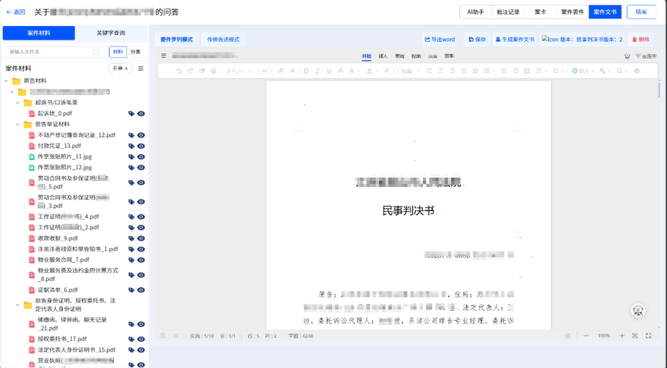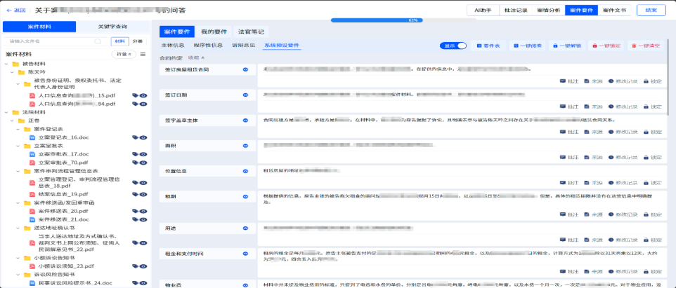 案件立案后,系统为法官提供了“一键阅卷”功能。法官打开案件,系统自动从案件的电子卷宗中,提取法官需要了解的相关案件信息,并将案件信息分成主体信息、程序性信息、诉辩意见、查明事实等多个部分。法官可以快速高效的审阅大模型对于案情事实的描述和分析,查明案件事实。大模型在提供案情事实描述的同时,还提供了案情事实的来源依据,法官可以通过大模型提供的溯源功能,直接打开相应的电子卷宗,查看原始证据材料。通过系统的辅助一键阅卷功能,法官可以在审理过程中不再通篇浏览所有的电子卷宗,通过针对性的阅卷,大大缩短了阅读卷宗的时间,提高了审判效率。据一线法官使用后反馈“使用系统后,原来一个案件3-4小时的阅卷时间,可在半个小时里完成,案件总体审理时间缩短了约三分之二”。通过人工智能辅助办案法官对卷宗内容进行初步的阅读整理,有效提高了法官查阅电子卷宗的效率,解决了全流程无纸化办案中的电子卷宗阅卷时间长,法官阅卷累的苦恼。