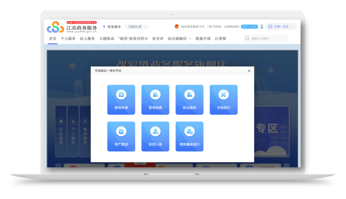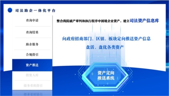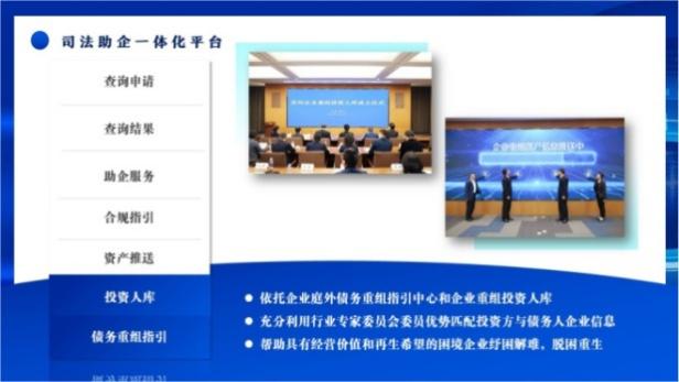 为加快营造市场化、法治化、国际化一流营商环境,优化民营经济发展环境,依法保护民营企业产权和企业家权益,张家港市人民法院联合张家港市市场监督管理局、行政审批局、人力资源和社会保障局、自然资源和规划局、住房和城乡建设局、公安局、税务局等部门成立“司法助企一站式服务中心”,并同步上线“司法助企一体化平台”。即在江苏政务服务网“张家港政务服务旗舰店”的“特色服务”模块中开通“司法助企一体化平台”入口。破产管理人和相关企业均可在江苏政务服务网实名认证注册,注册成功后点击“司法助企一体化平台”,出现“申请查询”“查询结果”“助企服务”“合规指引”“资产推送”“投资人库”“债务重组指引”等子模块,以数字化、智能化的方式提供集约化助企司法服务,助力企业提振发展信心。