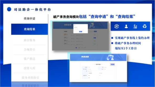 1.“申请查询”和“查询结果”破产事务查询模块,主要为破产管理人查询破产企业的企业登记档案、不动产信息、机动车信息等与企业破产相关的信息提供服务,实现破产事务线上集约办理,可将破产事务办理时间缩短至1个工作日。