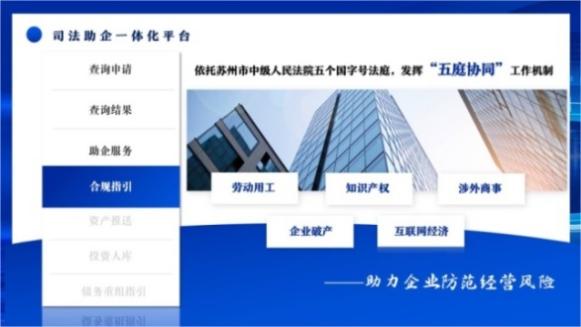 3.“合规指引”模块依托苏州市中级人民法院五个国字号法庭,发挥“五庭协同”工作机制,围绕劳动用工、知识产权、涉外商事、企业破产、互联网经济、企业内部治理等内容,从法院民商事纠纷化解角度为企业提供法律法规、政策规定、裁判规则等方面的合规制度供给,助力企业防范经营风险。