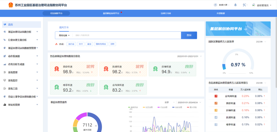 园区法院坚持和发扬新时代“枫桥经验”,在全国首创“基层治理司法指数协同平台”,着力以司法指数“小切口”融入社会治理“大格局”、做好诉源治理“大文章”。该平台形成了“以司法数据专题库为基础、以基层治理司法指数平台和基层解纷协同平台为两大场景”架构。一方面,依托“司法指数分析平台”开展“数助决策”,对5大类18小类基层治理类案件进行深度分析,提供风险预警、指数画像、态势分析等功能,更好服务党委政府决策科学化、社会治理精准化。另一方面,依托“基层解纷协同平台”开展“数助协同”,推动形成“横向到边,与部委办局深化府院联动机制”与“纵向到底,与社工网格员之间开展司法协助”的工作体系,推进基层纠纷实质性、高效率化解。