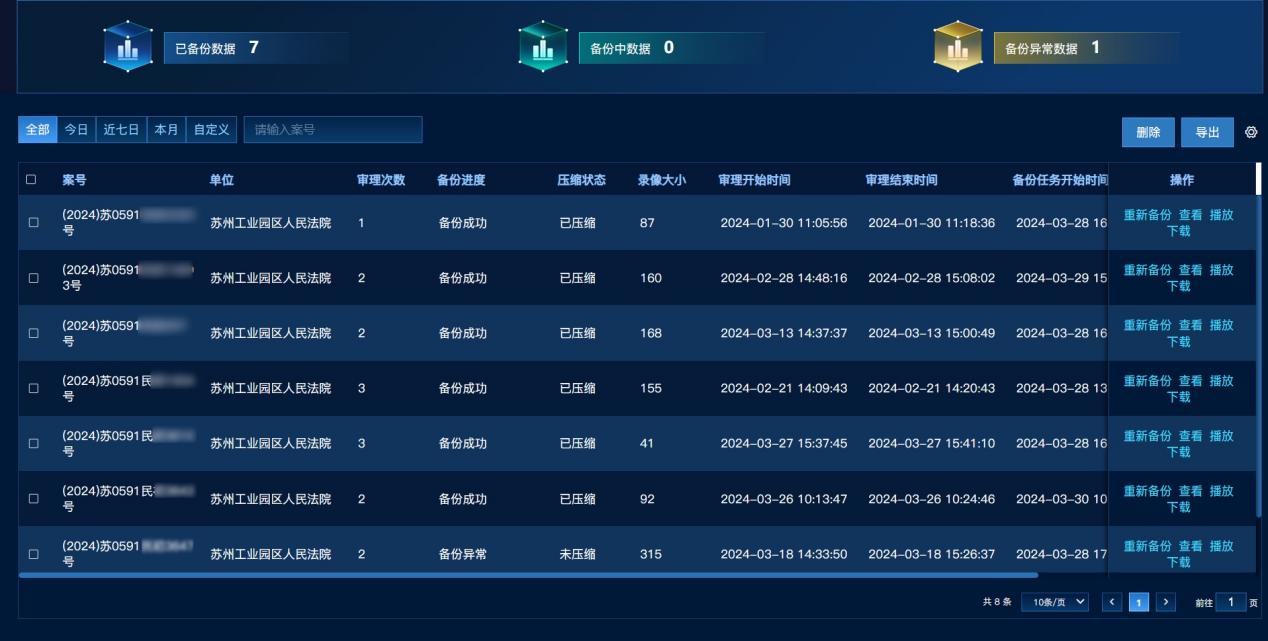 伴随人民法院科技法庭的普及,法庭监控设备数量增加、存储时长持续增长,以及庭审录像永久保存的刚性需求,导致大量录像视频将占用海量的存储空间,给人民法院的存储资源带来了巨大的压力。园区法院部署科达法院音视频管理系统,利用视频超压智能算法对法院庭审录像、笔录材料进行压缩备份存储,最大可节省75%的存储空间,极大地降低了园区法院录像存储压力,解决了历史录像丢失问题。同时,系统适配国产化电脑,审判人员可高效便捷地查看历史录像。