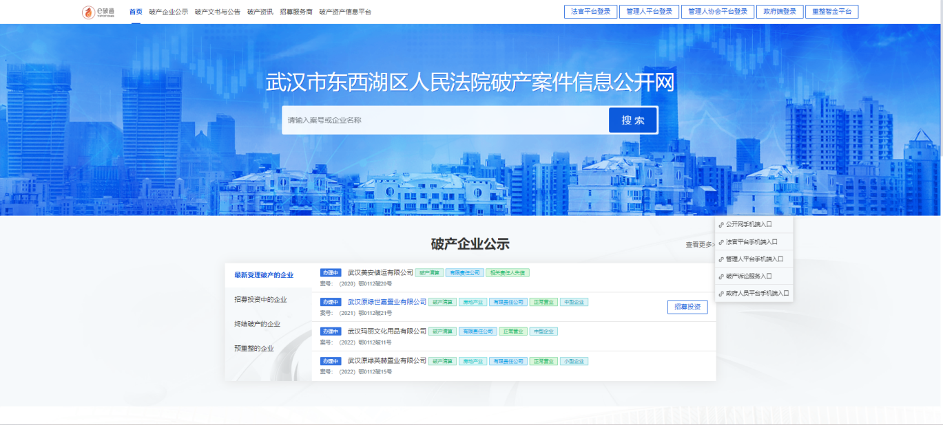 (1)湖北高院微信公众号-武汉地区首个“智慧破产平台”正式启动运行。