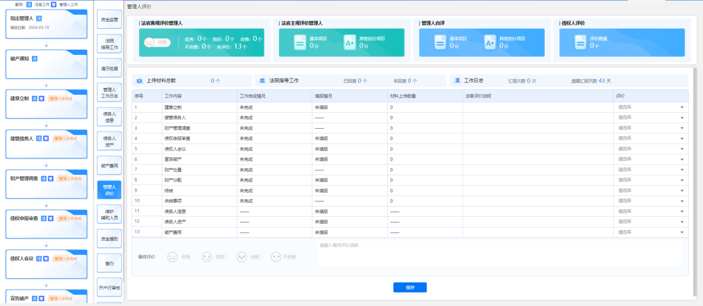 针对管理人监管及考核机制缺失的问题,智慧破产系统通过法官协同监管平台和管理人工作平台,实现了对管理人履职行为的全面监管和考核。系统通过记录管理人的工作轨迹、处理效率、案件质量等信息,为法院提供了客观的评价依据,促进了管理人的规范履职和专业能力提升。
