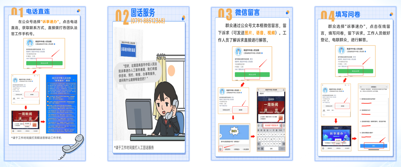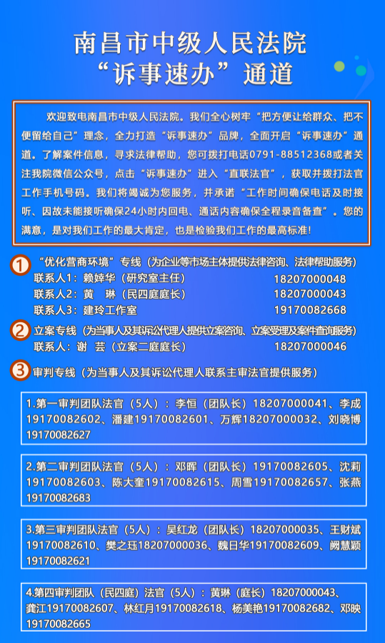南昌法院坚持“如我在诉”理念,秉持“把来人当客人、把来电当急电、把来信当家信”为民情怀,为确保群众诉求件件有回音、事事有反馈、次次有着落,截至目前,全市法院已公布500工作手机号码,12部固定电话,10条服务专线,切实做到群众诉求直通各项业务、直达各个团队、直连各位法官,确保了“电话打得通、法官找得到、诉求理得快、案件办得好、服务做得优”。此外,南昌中院还在官方微信公众号开通了“诉事速办”通道在线留言,群众可在微信公众号发送文字、语音、图片、视频等方式留下相应诉求,真正实现诉讼服务“网上办、就近办、不见面、不求人”。“诉事速办”通道运行以来,累计为涉诉群众和企业提供诉讼服务突破110万件次,其中2022年突破10万件次,2023年突破72万件次,2024年1至5月突破45万件次。