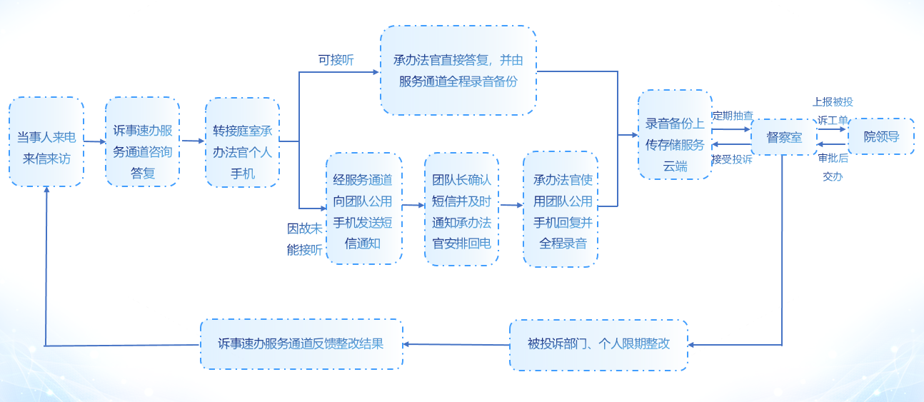“诉事速办”通道的所有通话均进行全过程自动录音并云存储,在保证诉讼服务有态度、有效率、有效果的同时,为法官与当事人、律师之间的联系提供了透明化、规范化渠道。督察部门依托“云储存”的数据定期对进行抽查,对“诉事速办”电话使用情况进行检查、对“诉事速办”反映的问题进行核查处理。“诉事速办”通道还设立投诉举报专线,南昌法院督察部门专责受理、核查、答复群众投诉举报事项,有效防范可能存在的法官与当事人、律师不正当接触交往廉政风险,为落实“三个规定”筑起一道看得见的“防护墙”。此外,南昌两级法院建立了常态化督察检查机制,定期对“诉事速办”呼入电话、转接电话、回拨电话录音进行抽查,并对“诉事速办”电话使用情况进行突击检查,对违反操作规程的干警依规依纪进行处理。现已累计交叉督察84轮次10000余人次,问责14人次。