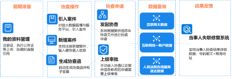 当事人失联修复系统是流程规范、数据全面、成功率高、不限次数的专业在线协查工具,法官在法院专网的电脑登录系统,便可发起协查。整体协查流程如下图: