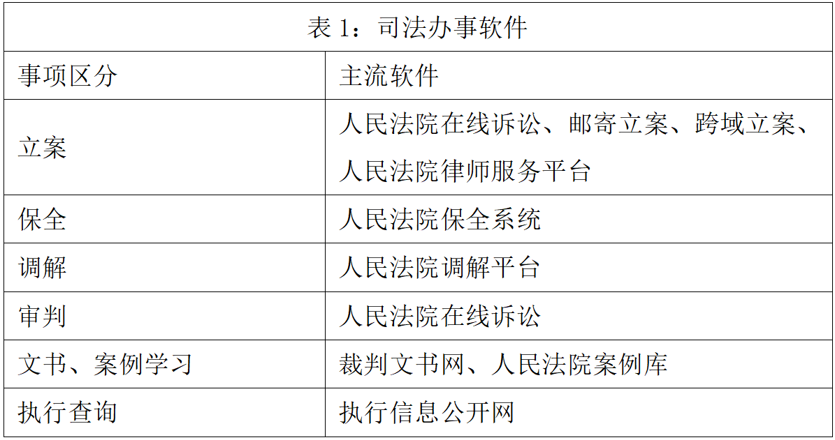 在多个层级一同发力下,社会公众得以享受到不同层级的软件服务。从法院的流程来看,往往涉及立案、审判、调解、保全、执行等方面。常见使用情况如表1。