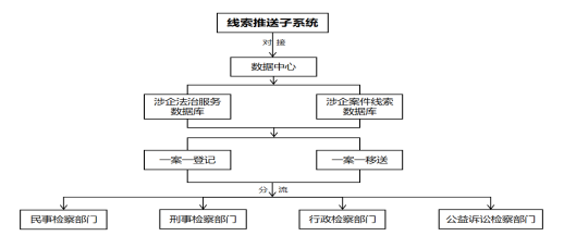 (二)“线索推送”子系统。以高质量实现合力护企为要求,检察机关控申部门通过线索推送子系统登录数据中心涉企法治服务数据库和涉企案件线索数据库,获取涉企服务诉求信息和涉企案件线索信息,根据其涉及的内容及性质,一案一登记、一案一推送,分流至四大检察部门。如下图: