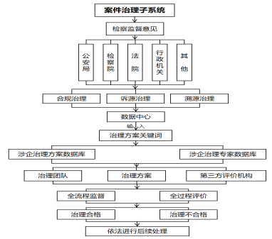 (四)“案件治理”子系统。以高质量保障企业权益为核心,四大检察部门联合公安局、法院、行政执法机关和其他组织等,开展合规治理、诉源治理、溯源治理,做好涉案企业“后半篇文章”。通过案件治理子系统登录数据中心涉企治理方案数据库和涉企治理专家数据库,根据检察监督意见,输入治理方案关键词,获取所需的治理团队、治理方案和第三方评价机构。治理工作开展后,检察机关实施全流程监督,第三方评价机构实施全过程评价,本系统全轨迹留痕。对治理合格企业可依法免除或减轻刑事处罚或行政处罚,对治理不合格企业应依法实施刑事处罚或行政处罚。如下图: