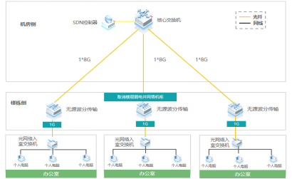 以太全光网络只在核心机房和信息点位使用有源设备,楼层弱电间采用无源设备,大幅减少网络故障点,增强稳定性。以太全光网络采用独享千兆/万兆接入,大幅增加了检务工作网络接入带宽,人员办公、数据通信等场景更高效。