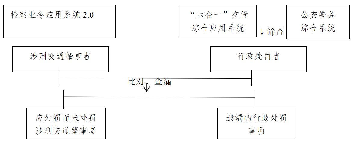 第三步:筛查出应当行政处罚而未处罚的涉刑交通肇事者人员信息和遗漏的行政处罚信息。将涉刑交通肇事者人员信息与已经作出行政处罚的涉刑交通肇事者人员信息比对、查漏,如存在空白项,即为应处罚而未处罚的涉刑交通肇事者;如果人员信息相等,存在行政处罚信息项目少于两种,即为遗漏行政处罚事项。