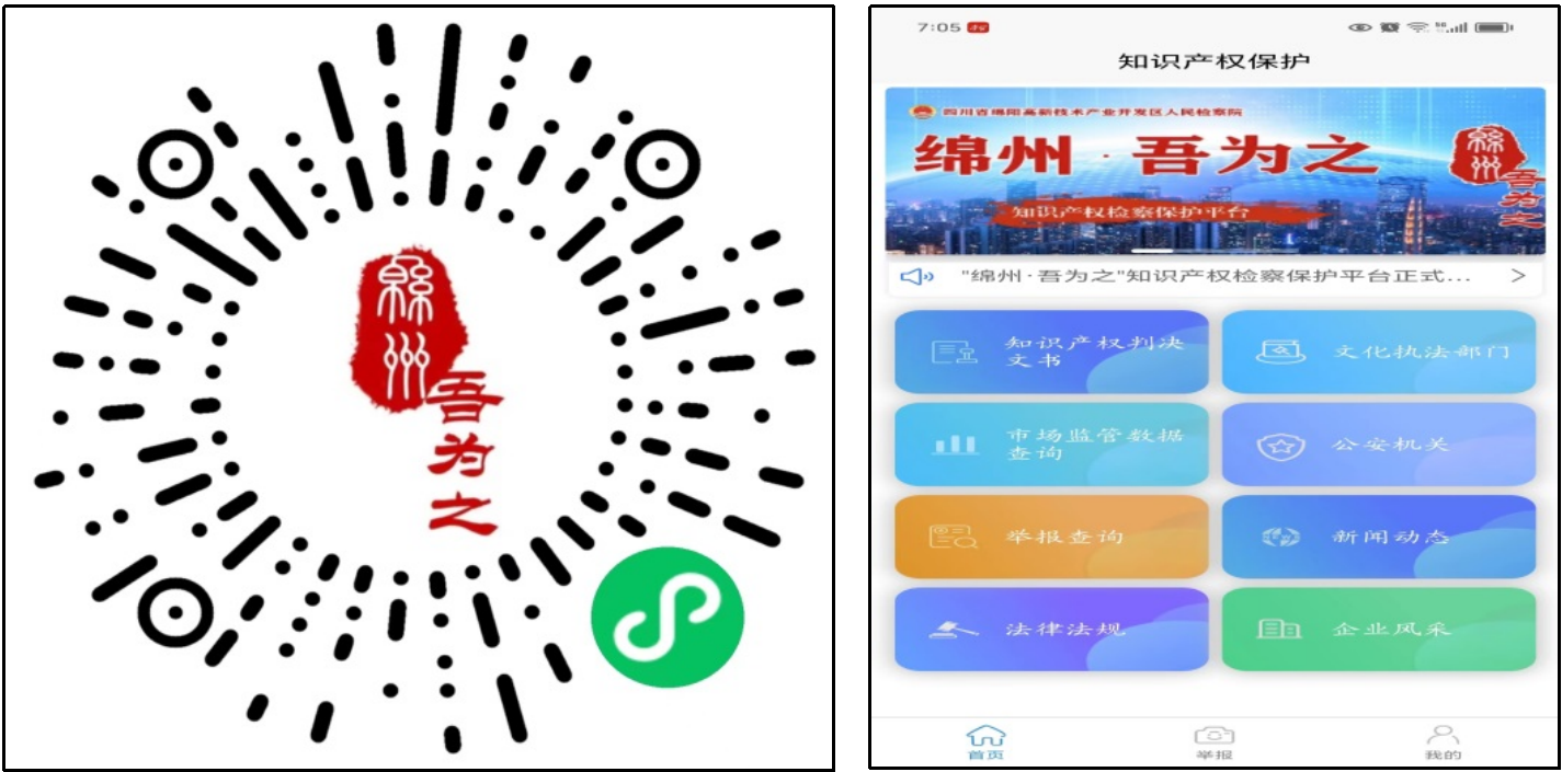 “绵州·吾为之”微信小程序包含新闻动态、团队介绍、案例展示、法律法规、科普知识、企业风采、检企对接、线索举报八大板块。小程序的主要功能:一是开展知识产权保护宣传。设置法律法规、典型案例、科普知识等模块,多方式开展知识产权科普,提升群众知识产权保护意识;二是受理知识产权侵权线索。设置曝光台模块,方便群众曝光身边的违法侵权行为,并将线索推送给行政机关、公安机关,实现举报线索件件有回应。三是畅通服务企业的通道。搭建24小时沟通平台,为企业提供24小时法律咨询在线服务。