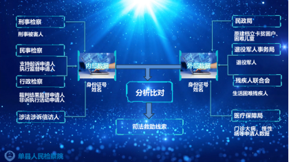 1.确定数据中的身份证号字段为主要比对点,姓名字段为辅助比对点,比对内部数据和外部数据,比对成功后,说明该当事人既进入了检察办案环节,又包涵存在困难情况的因素,即司法救助案件线索。