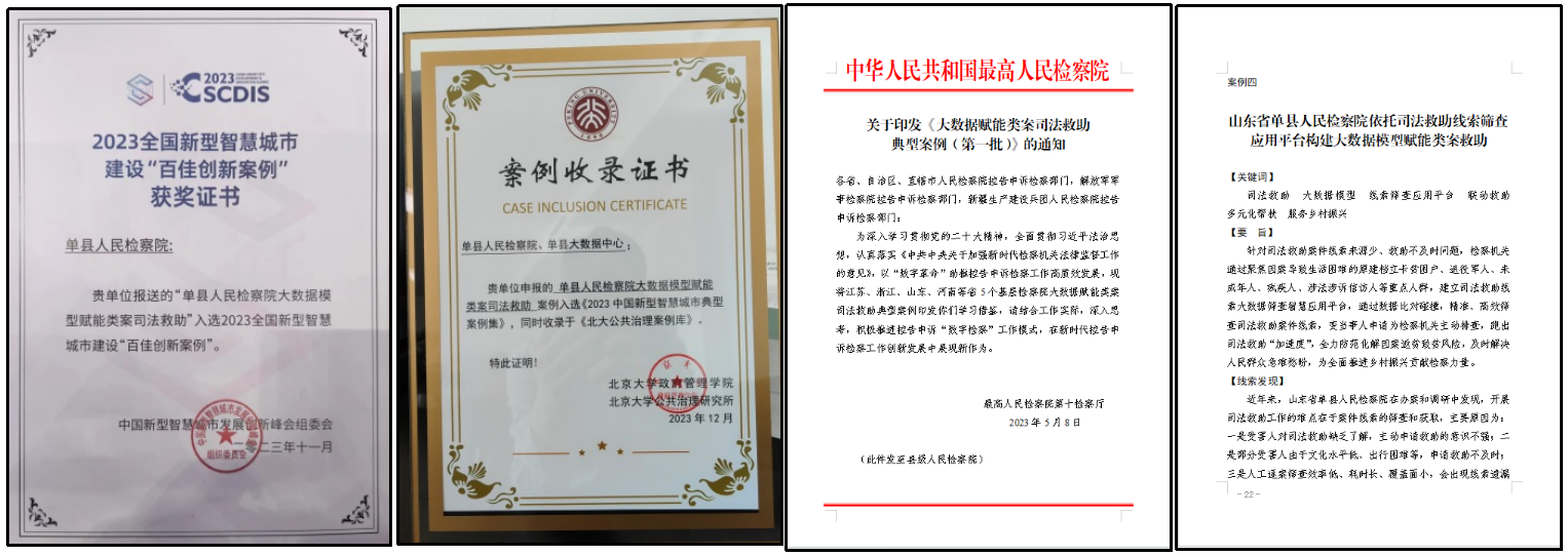(三)推广应用,优化完善社会治理。该模型在山东省检察机关推广应用后,发现司法救助线索1943件,依法救助943人,发放救助金784.8万元,取得综合治理成果24件,让人民群众充分感受到司法温暖,充分发挥数字赋能国家司法救助的职能作用,凝聚司法救助合力,高质效办好每一件案件,不断提升人民群力众的获得感、幸福感和安全感。经实际检验,该模型实用性、可复制性强,入选最高检大数据赋能类案司法救助典型案例(第一批),获评2023全国百佳创新案例,并被北京大学收录于《北大公共治理案例库》,同时被山东省电视台、最高检门户网站、《检察日报》等媒体相继宣传报道。