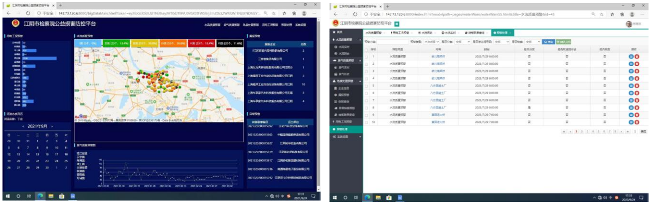 将预防生态环境损害结果发生纳入检察公益保护范畴,以智慧公益诉讼平台数据库为基础,接入生态环境部门危险废物动态管理、大气实时监管、环保设施运行监控等环保执法子数据库,搭建环境污染源统一管理和共享平台,通过实时查询,自动抓取水、大气以及危险废物污染等环境风险源,按照风险等级建立预警提示,实现对生态环境领域公益损害情况全过程监督和风险智能预警。如中心发现危险废物异常转移线索且达到一定风险等级后,自动推送给办案人员,办案人员核查后向行政机关发送风险提示函,督促其提前介入避免公益损害发生。