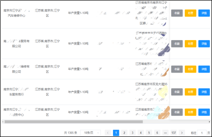 从市场监督管理部门和行政审批部门调取了辖区内登记在册的汽车维修企业市场工商注册信息。从交通运输部门提供的汽修企业中筛选出依法报备的汽车维修企业数据,按照乡镇、街道建库。从生态环境局的业务系统平台筛选出了依法进行危险废物转移登记的汽车维修企业。