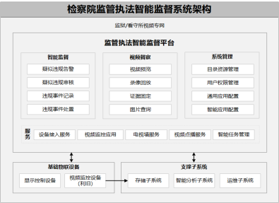 在看守所/监狱视频专网内建设一套监管执法智能监督平台,采用前端点位直连的方式实现对看守所/监狱已建视频的接入,并对存储、智能分析、运维子系统进行统一管理,为检察官用户在进行监管执法监督时,提供视频督察和智能监督等应用。
