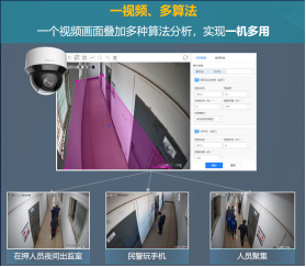 支持一视频、多算法,比如监区走廊视频,配置在押人员夜间出监室、民警玩手机、人员聚集等多个算法,实现一机多用。