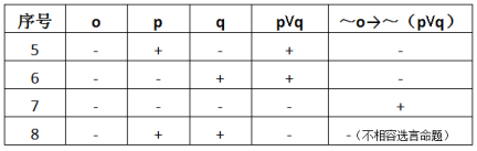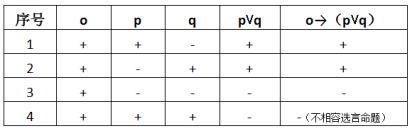 然而上面的真值表并没有对所有情况都罗列,因为我们是以o为真作大前提,而实际上,o也可能为假。即当强制措施不为取保候审时,一样需要作出判断。这时我们发现该法条其实是充分必要条件的假言命题(当且仅当):无取保候审则无须保证人或保证金,有保证人或保证金一定对应取保候审。即:o↔(p⋁q)。据此我们可以得出,非取保候审时,保证人姓名或保证金为真,整个命题亦为假。完整的真值表应该如下: