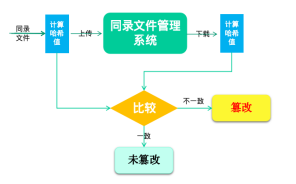 实践探索过程中,基于检察工作网环境,我们采用“哈希值校验技术”,在同录文件上传前,计算其哈希值,将同录文件与其哈希值一并上传至“同录文件管理系统”。后期使用时,再从系统中下载对应的同录文件,计算下载后文件的哈希值。比对前后两次哈希值结果,可判断出同录文件否发生过变化。只要哈希值未变,同录文件便不会发生任何变化(即未被篡改),具有原始性,可以正常使用。具体架构如下: