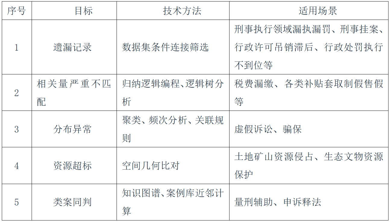 实现个案办理到类案监督的放大效应的关键就是构建高可用、符合法律原义的监督模型。实践中大多数的大数据法律监督模型的构建路径:“个案办理—法律法规和先验知识判断—归纳抽象研判逻辑—收集可用数据—具化逻辑规则—全量数据检验—可疑数据集”,这一路径在数据科学中被称为归纳逻辑编程法。建构大数据法律模型按照数据集目标可归纳分类如表1: