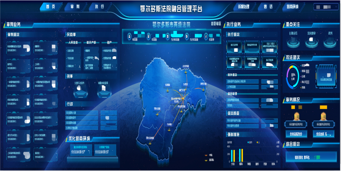 内蒙古自治区司法厅始终以铸牢中华民族共同体意识为主线,以“智慧法治”工程为载体,发挥信息化引擎驱动作用,夯实“大平台”应用,打通“大系统”中枢,搭建司法行政决策支持系统。利用大数据技术,基于空间地理信息构建可视化数据分析模型,集司法行政“一个统抓、五大职能”于“一张图”,为管理决策者提供全面依法治区和司法行政工作统揽、数据融合分析、一键指挥调度等功能,以智能化手段助力决策支持更高效、科学、精准。
