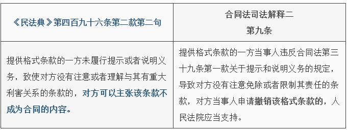 相比合同法司法解释规定的可撤销与无效的法律后果,《民法典》将违反提示及说明义务的法律后果明确为“合同相对方可以主张不成为合同内容”,也即经相对方主张后,该格式条款不成为合同内容,对双方均没有约束力。体系上更为科学、严谨。
