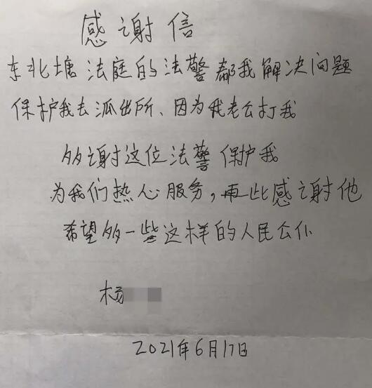 “对能在如此短的时间内看到判决书激动不已!我们为您点赞!” 2021年6月,东北塘法庭吴坚法官收到一封案件当事人家属的来信。