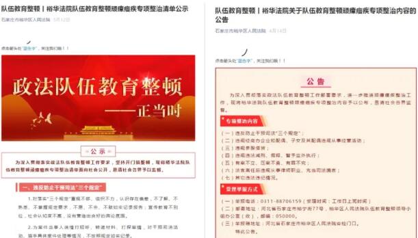 问题找准了,就要对症下药。随后,裕华法院通过官方网站、微信公众号、今日头条等平台发布《裕华法院队伍教育整顿顽瘴痼疾专项整治清单公示》《裕华法院关于队伍教育整顿顽瘴痼疾专项整治内容的公告》,重点围绕“六大顽瘴痼疾”进行公开,畅通监督渠道,明确监督举报受理时间、举报电话和举报信箱地址,主动接受社会各界监督。与河北师范大学开展院校共建,开展特邀调解员培训进一步前移矛盾纠纷多元化解关口,打造“法院+邮政”的集约送达模式,防范打击虚假诉讼专项整治……一系列群众“期盼”转化为实际行动。