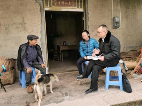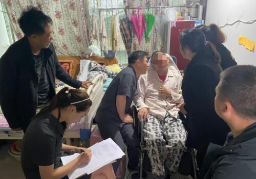 在狭小的屋内,承办法官俯身耐心听取吴某和妻子刘某的意见,在确定双方真实意思表示后,主持双方达成了离婚调解协议,并与社区工作人员一同向吴某家人解读了相关帮扶政策。