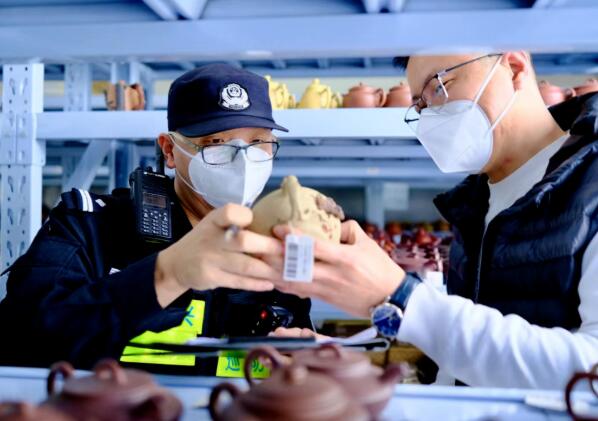 不久前,丁蜀警务站接到石某报警称其烧制好的33把茶壶被盗,损失上万元。经动态查控,案发后两小时,犯罪嫌疑人某在驾车途经双龙路时被我站巡逻警力设卡抓获,并在其住处追回了被盗的33把茶壶。