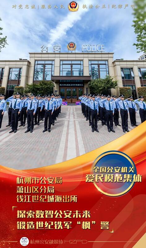 2022年5月25日,全国公安系统英雄模范立功集体表彰大会在京召开,隆重表彰近五年来在各项公安工作中作出突出贡献的先进集体和个人,萧山区公安分局钱江世纪城派出所荣获全国公安机关爱民模范集体。
