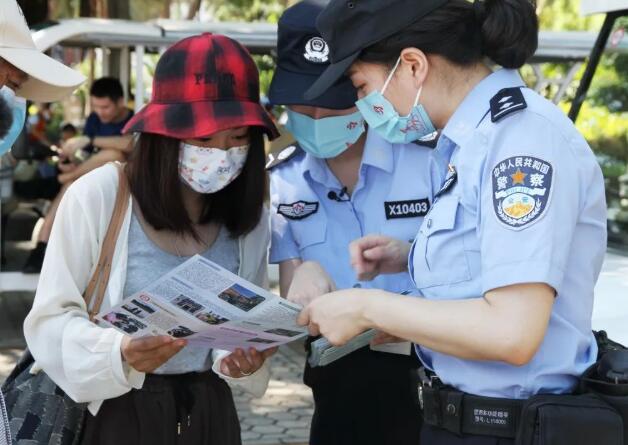 鼓浪屿街心公园附近的小吃街,中午时分人流如织,女警队员会趁着这个时段拿着印有典型诈骗案例的宣传单,来到这里对游客、商家进行反诈宣传。遇上来鼓浪屿旅游的外国游客,队员们也能自如地切换英语提醒。