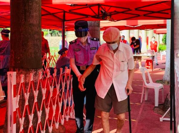 鼓浪屿街道肯德基对面小公园采样点是岛上一处人流量较多的核酸检测点,遇到人流高峰期,女警队员也都会过去协助维护秩序。
