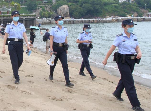 暑假旅游高峰期,游客被困礁石的警情多发。鼓浪屿海岸线上的几处热门沙滩是“屿家亲”女警队每日巡逻的重点。退潮时,女警队员常常要踩着超过40摄氏度的沙子,拿着大喇叭,沿着沙滩进行安全宣传。