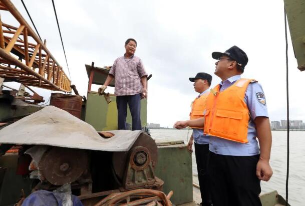 ▲图为市公安局宜城水上派出所民警在东氿湖上开展防台巡逻时帮助搁浅的作业船脱困。