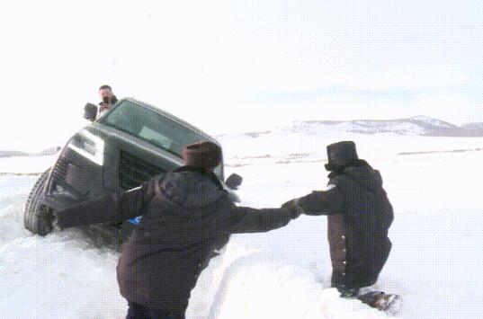 救援路上又发现两辆抛锚在雪窝中的车辆,其中一辆黑色越野车已经半个车身侧翻在路边沟壑内,情况十分紧急。
