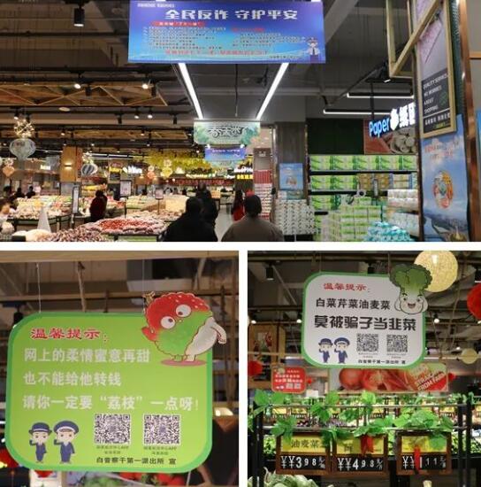“反诈超市”以“提升全民反诈意识、共筑电诈防火墙”为主题,以群众喜闻乐见的方式,在超市蔬菜区、水果区等群众光顾频率较高的区域,量身定做了反诈宣传“萌语”版标语牌。相比于传统的反诈形式,这些有趣的警示标语更易吸引群众注意,瞬间让充满烟火气息的超市成为反诈宣传新阵地,群众在逛超市的同时学习反诈知识,切实提高了群众的反诈防骗意识。