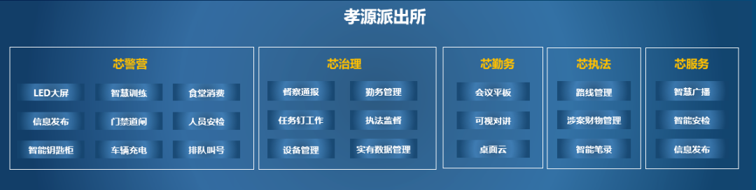 孝源派出所在传统安防的基础上导入了智慧用电、食堂消费、桌面云、会议平板、新能源汽车充电桩、智慧训练等系统,成为全国智慧派出所新标杆。