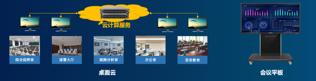 派出所配备桌面云,代替传统电脑满足派出所日常工作,保障设备的统一运维和数据安全。在综合指挥室、接警大厅、户籍服务大厅等场所部署会议平板满足投屏上墙、会议交互等需求。