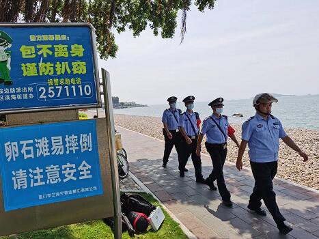在环岛南路沿线,曾厝垵派出所组建起一支群防群治队伍,民警、海防辅警及保安等展开动态巡逻,劝离在有安全风险隐患地段游泳的游客。