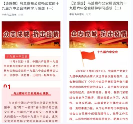 2021年11月8日至11日,中国共产党第十九届中央委员会第六次全体会议胜利召开。会后,乌兰察布市公安局机关紧密结合党史学习教育,迅速掀起大学习、大宣传、大落实热潮。坚持把学习贯彻十九届六中全会精神作为首要政治任务,作为党史学习教育的核心内容,坚持党委带头、全警参与,全方位组织开展集中学习、专题研讨等多层次、多形式的学习宣传贯彻活动,从厚重党史中体会奋斗历程、汲取奋进力量,从习近平新时代中国特色社会主义思想中感悟真理伟力、指导工作实践,从形势判断中感知风险变化、靶准工作方向,从奋斗路径中筑牢忠诚警魂、强化使命担当,把忠诚和担当体现在打防犯罪、社会治理、护航发展的具体任务中,融入到履职尽责、攻坚克难、便民服务的实际行动中,以史为鉴、开创未来,埋头苦干、勇毅前行,忠实履行好党和人民赋予的新时代使命任务。