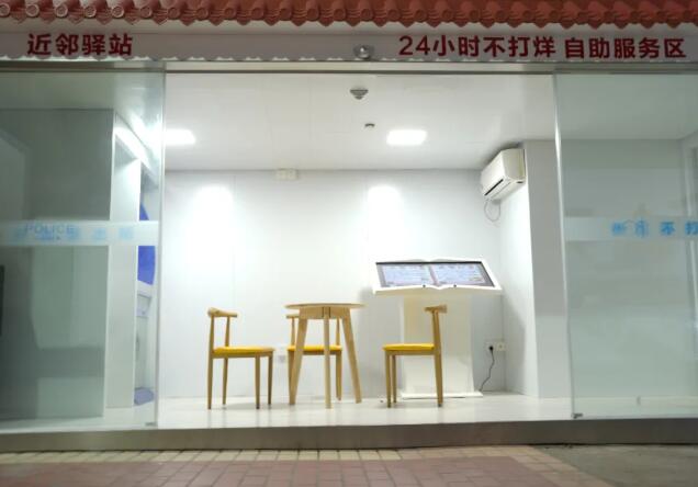 右边是一个“蘑菇屋”,叫近邻驿站。不仅供群众歇脚,里面摆设的这台“e政务”便民服务机“刷脸”“刷身份证”就可以自助办理包括公安在内的17个部门162项业务。比如打印未带身份证需要开具的住宿证明、亲属关系证明等,都是咱群众经常需要的。