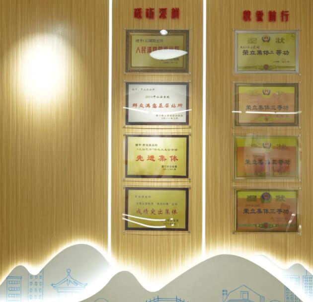 这里是我们的薪火荣誉馆,墙上金灿灿的奖牌是群众对我们工作的认可。