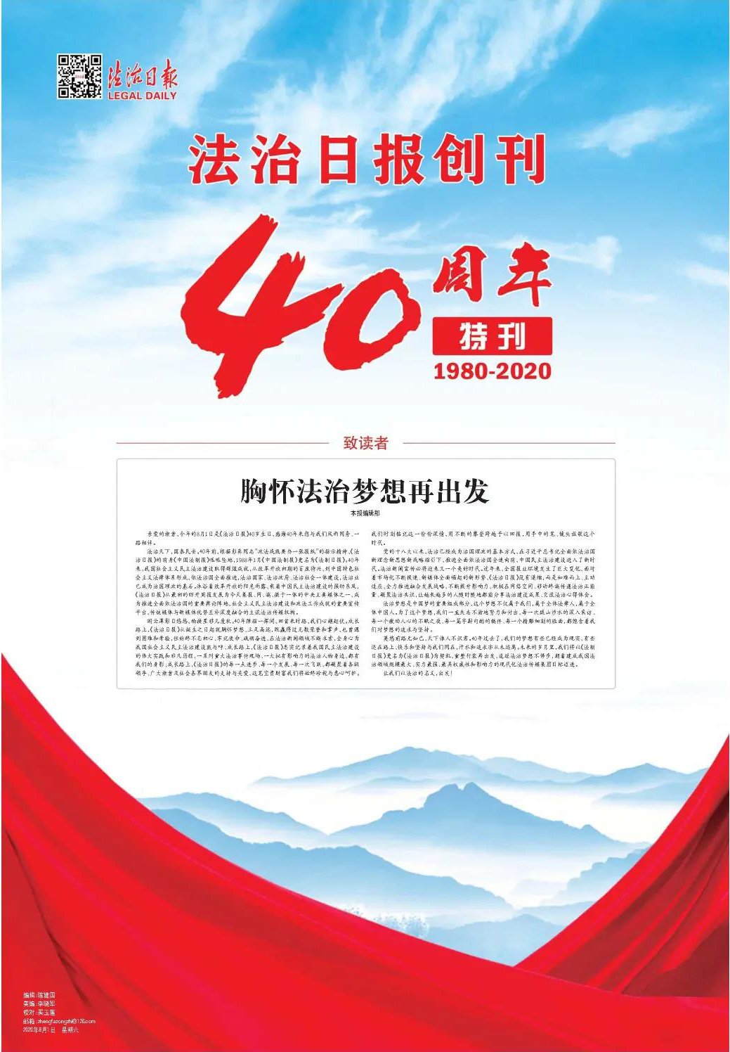 [法安导读]2020年8月1日,在《法制日报》40岁生日之际,经中央政法委员会、司法部同意,并报国家新闻出版署批...
